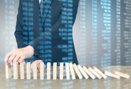 Close up of businessman hand Stopping Falling wooden Dominoes effect from continuous toppled or risk, strategy and successful intervention concept for business.