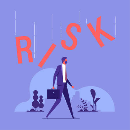Miniature people : businessman standing on a wood cube word with risk. Business risk assessment or management concept