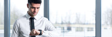 Handsome elegant man standing in office in corporation. Checking time on his watch