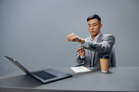 Asian man sitting at a desk in front of a laptop work writing in a notebook Gray background