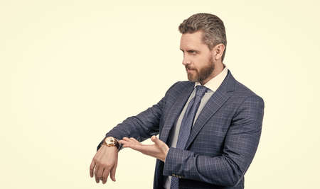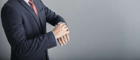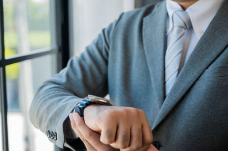 Watch is a new style. Senior manager point finger at wrist watch. Time management