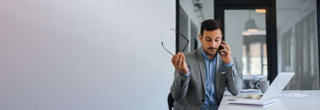 Banner panorama of stressed out troublesome businessman in office making important phone call about serious problem working under pressure and tight deadline receiving bad market news recession copy