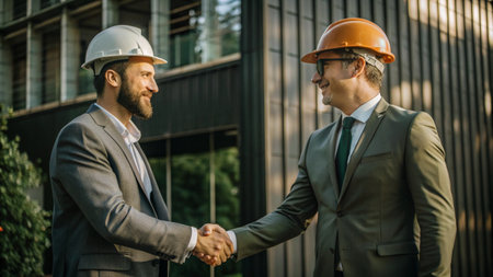 businessmen in helmets shaking hands with each other while standing near building