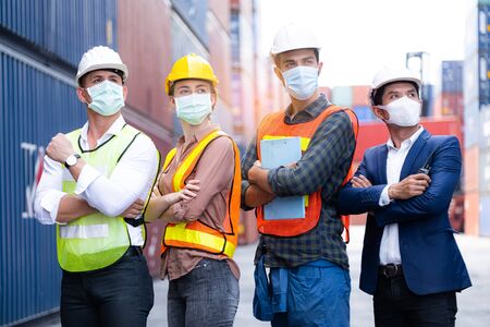 American and Asia worker wear mask to prevent coronavirus (Covid-19). Standing arms crossed at the container shipping area. Industrial and COVID protection concept.
