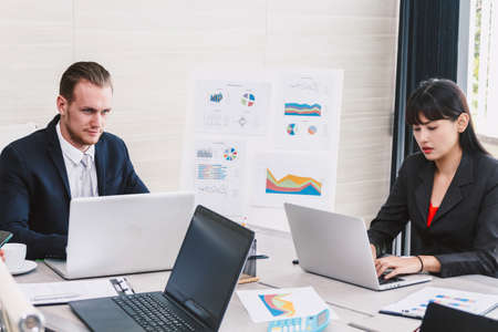 Businesspeople using laptops and discussing together in meeting room.Teamwork concept