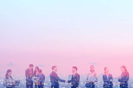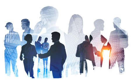 Silhouette of business people work together in office. Concept of teamwork and partnership. Double exposure effects