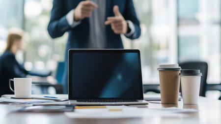 In a moment of analysis a political advisor gestures towards a laptop open on the table surrounded by notes and coffee cups. The blurred outlines of colleagues in a corporate backdro