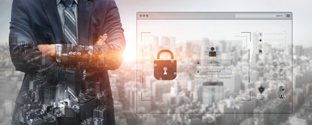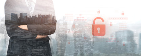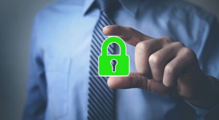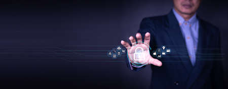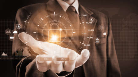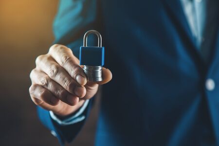 Businessman holding padlock protecting business and financial data with virtual network connection, Technology and digital marketing, Financial and banking