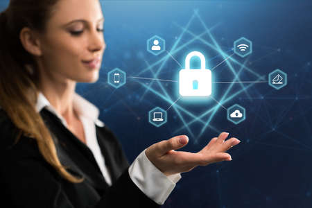 Businesswoman hand using laptop with Data protection, Cyber security secure, information safety and encryption concept. internet technology and business concept.