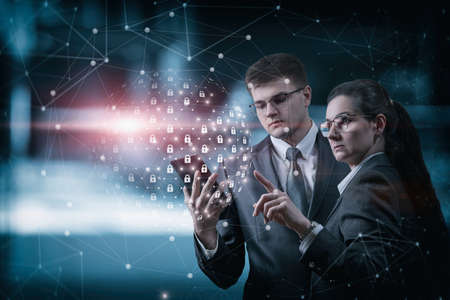Two businesspeople in formal wear working on the project to protect cyber security of international company using smartphone and laptop. Padlock Hologram icons. Teamwork concept.