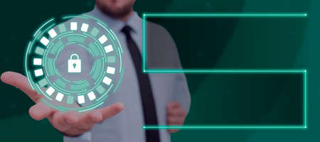 A programmer is typing a code on computer to protect a cyber security from hacker attacks and save clients confidential data. Padlock Hologram icons over the typing hands. Formal wear.