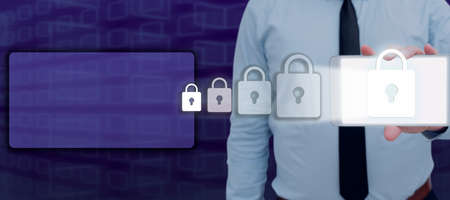 Multi exposure of man's hands holding and using a digital device and lock drawing. Security concept.