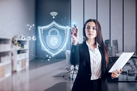 Attractive young european businesswoman with abstract web protection and thumbprint id safety hologram on blurry office interior background. Software and cybersecurity concept. double exposure