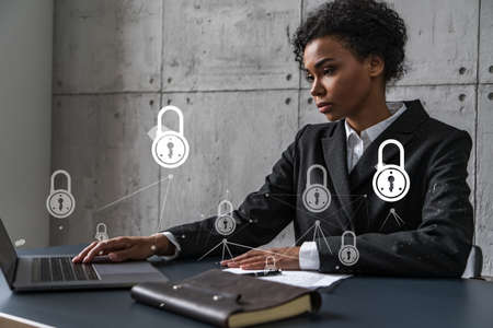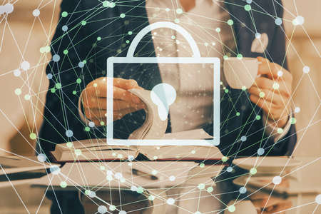 Businesswoman typing on laptop work in modern office on new project. Lock icon drawing hologram. Double exposure. Concept of success.