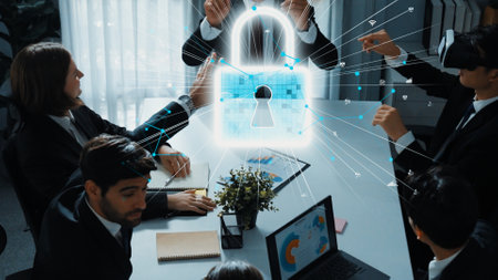 A professional business team engages in a virtual reality session discussing data security, surrounded by digital graphics that represent information protection and innovation.