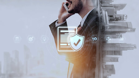 Businessman using on-line app on phone. Lock hologram. Multiexposure. Internet security concept.