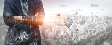 Cybersecurity data protection. Businessman holding padlock protect business financial and virtual cyber network connections. development of intelligent technology innovations from digital attacks.