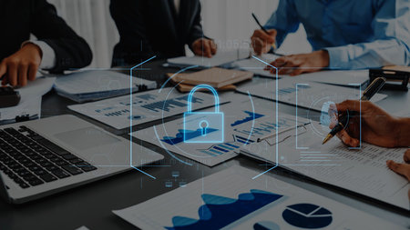 Two businesswomen working on the project to protect cyber security of international company. Padlock Hologram icons over the table with documents.