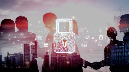 Group of business colleagues as a part of multinational corporate team working on project to protect clients information at cybersecurity compliance division. IT lock icons over Kuala Lumpur