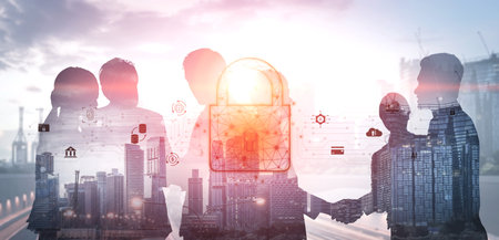 Multiexposure of two businesspeople handshake and lock icon hologram drawing background. Concept of internet business security information data. Formal wear.