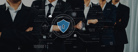 A professional team in business suits stands confidently, showcasing unity and strength while emphasizing the importance of cybersecurity and data protection.