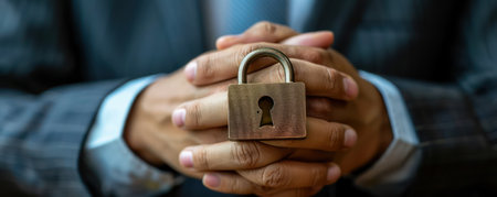 close-up, out of focus hand of a man in a business suit holding a lock. On a gray background. data security protection concept. Database. Protection of personal data. The lock in the hand. Businessman in defocus, in the foreground holds a lock in his hand, in focus