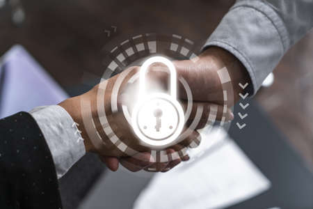 Handshake of two businesspeople who are negotiated the project to protect cyber security of international company. Padlock Hologram icons. Woman in business.