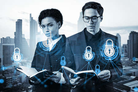 Group of business colleagues as a part of multinational corporate team working on project to protect clients information at cybersecurity compliance division. IT lock icons over Singapore