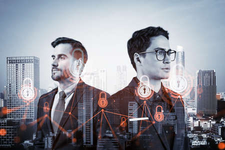 Two handsome businessman in suits thinking about career opportunities at cybersecurity compliance division to protect clients confidential information. IT lock icons over Bangkok background.