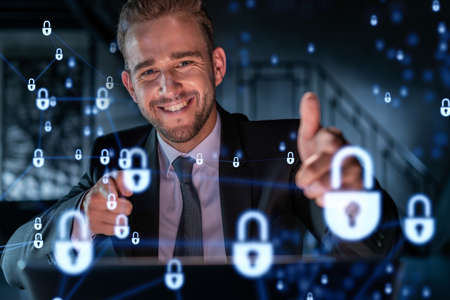 Portrait of handsome businessman thinking how to protect clients confidential information and cyber security. IT hologram padlock icons over office background.