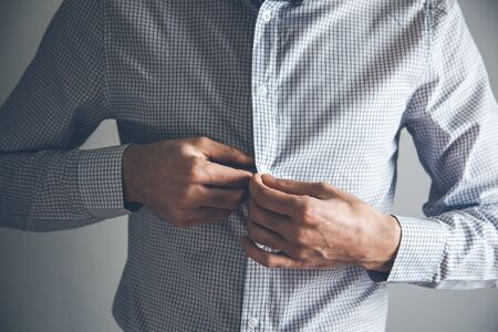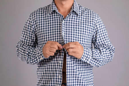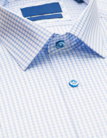 blue shirt with checkered pattern and with a focus on the collar and button, close-up