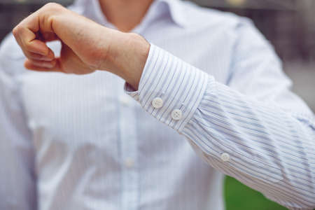 Sleeve of a white shirt. Buttons on Cuffs. close up view