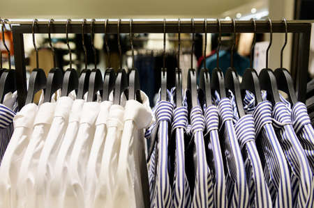 sale, shopping, male fashion, style and wear concept - close up of shirts with ties at clothing store
