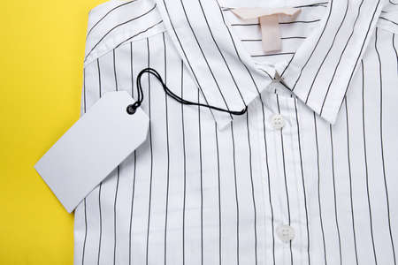Small gray stripes men's shirt with a price tag and yellow-orange tag lanyard