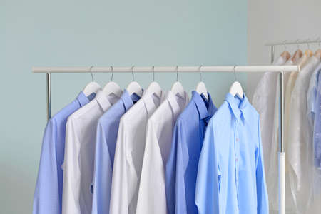 Light blue shirt with long sleeves. Formal shirt on wooden background. Beautiful buttoned blue shirt on sale.