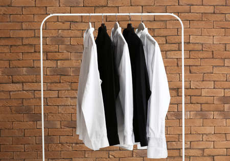 Closeup colorful male, female clothes in boutique hanging on hangers, clothing rack on metal stand. Concept opening luxury shop, shopping mall, store sale, retail fashion store, second hand outlet.