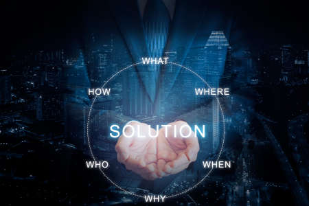 Double exposure of Professional businessman in blue tone background hold SOLUTION on hand in business concept