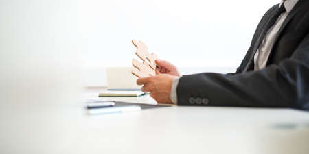 Hand holding the puzzles for the businessmen to work together as a team. Concept of planning work as a teamwork. Closeup of businesspeople holding jigsaw puzzle.