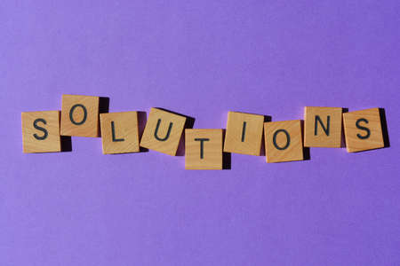 Solutions, word in wooden alphabet letters isolated on purple background as banner headline