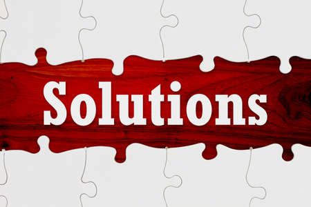 The word solution on wood stamps with little jigsaw pieces on foreground and group of large jigsaw pieces on background, idea of problem solving with brainstorm possible solutions