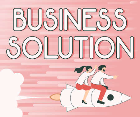 Text sign showing Business Solution. Word for Services that include strategic planning and evaluation Illustration Of Happy Partners Riding On Rocket Ship Exploring World.