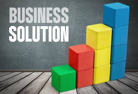 wooden cubes with red letters on blue paper, solution concept with copy space