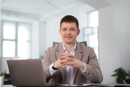 A well dressed man with a warm smile stands confidently in a contemporary office environment. Sunlight streams through large windows, creating an inviting atmosphere that enhances his professionalism.