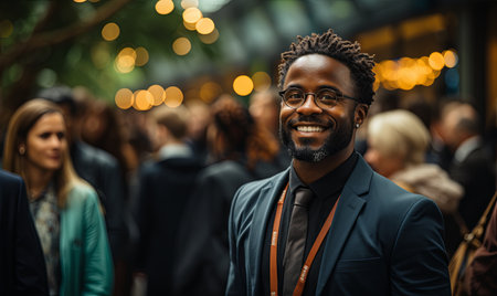 Businesswoman wearing a lanyard with a badge, smiling and engaging with others during a corporate event or conference setting