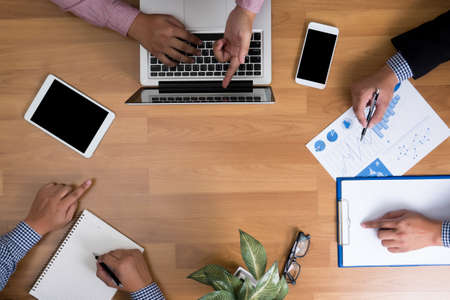 Businessman and team analyzing financial statement Finance task. with smart phone and laptop and tablet. Wealth management concept
