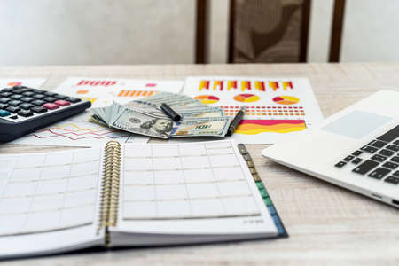 Closeup of Asian female writes something on business charts under bunch of dollars banknotes nearby her labtop and a cop of coffee for business, finance, tax and people concept