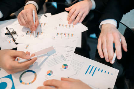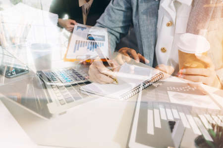 Business team brainstorming and discussing with financial data and report graph. Teamwork meeting working concept.