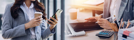 Sales are working together to summarize monthly sales to bring in a meeting with executives, female employees using smartphones to view sales data. Sales management concept.
