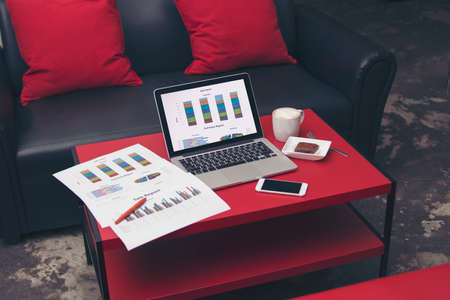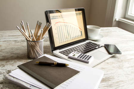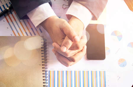 business man working with many document graph and laptop on his desk in morning light. business concept.