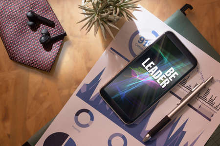 Be Leader inspirational background concept. Flat lay top view of Be Leader text on Smartphone with business chart, necktie, wireless earphones on businessman's wooden working office desk.